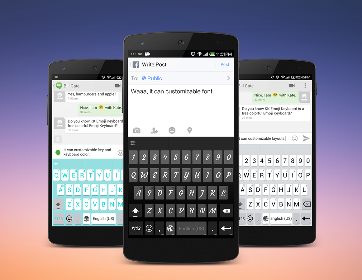 KK Emoji Keyboard es un teclado libre, inteligente y colorido Emoji para Android que te ayudarán a ayunar de entrada de más de 3000 emoji, emoticons, smiley, etiqueta engomada y la cara de texto convenientemente todas partes, incluyendo mensaje, texto, correo electrónico y chatear con aplicación social etc. Es la mejor Emoji teclado para Android con más de 100 temas hermosos, tipo gesto inteligente y autocorrección, altamente personalizar con el color, el diseño, la fuente y el apoyo de más de 55 idiomas.