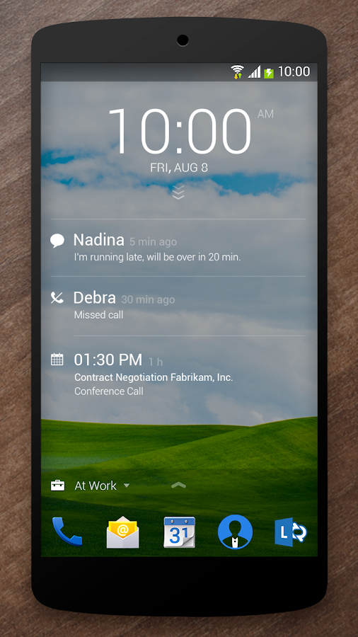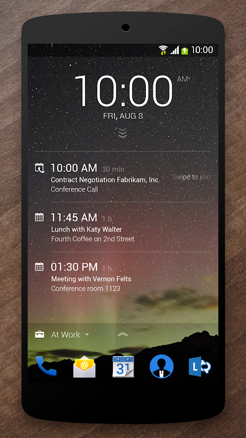 - Calendario: rápido vistazo a su día y desplazarse a través de las próximas reuniones y su ubicación para planear su día de un vistazo.