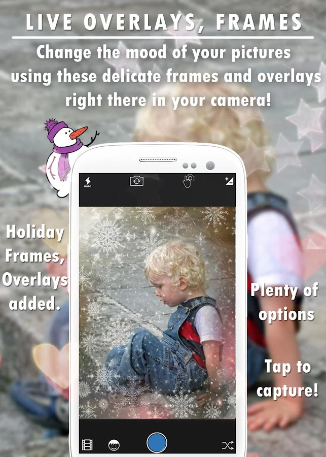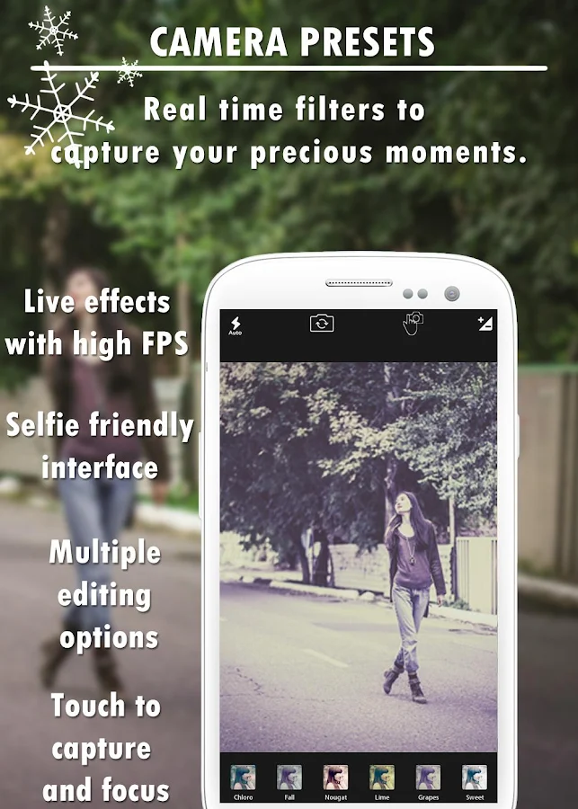 PhotoSoft ofrece lo mejor en el mercado de cámaras en vivo imágenes prediseñadas. Añadir pegatinas exclusivas, leyendas, marcos y superposiciones de los filtros de la cámara en tiempo real y efectos artísticos. Así que sólo encender la cámara, elegir un efecto, añadir imágenes prediseñadas y toque! Eso es todo! Acabas de llegar a ti mismo una obra maestra.