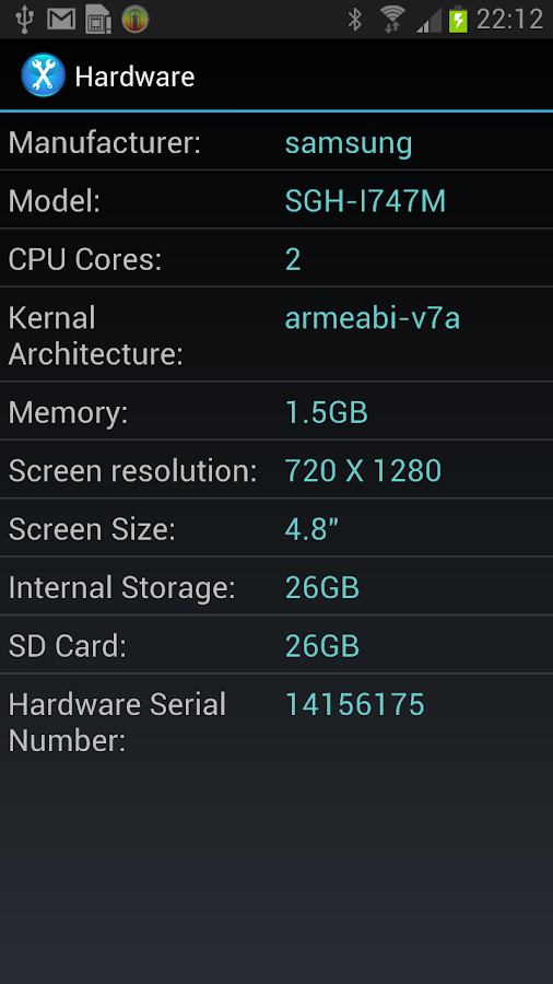 * Telefonía información, como el tipo de tarjeta SIM, el número de teléfono, el operador de red y el IMEI.