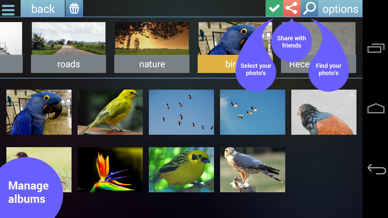 - Fácil de usar la organización de fotos. Las fotos y vídeos se clasifican automáticamente en álbumes editables que pueden ser editados por el usuario. Buscar y fotos de subtítulos fácilmente. Disfruta de imágenes en una presentación de diapositivas.
