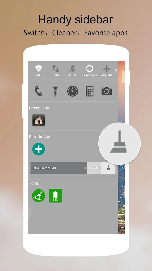 Incluya Limpia, Antorcha, aplicación de Favorate, app recientes, aplicación inteligente y más