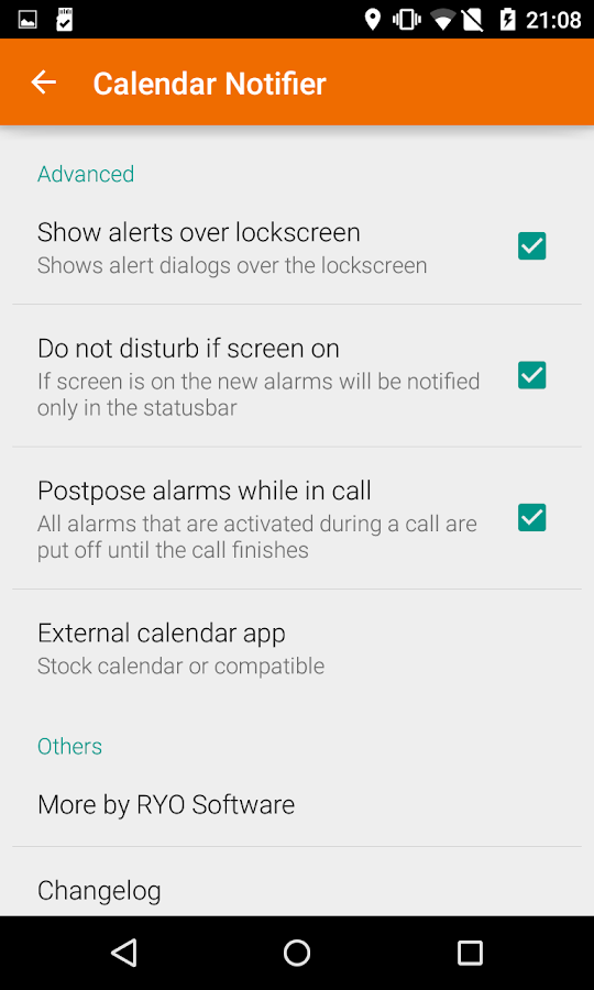 Con esta aplicación se puede configurar el sonido, el tipo de vibración y su patrón, liderado color, intervalo de repetición y mucho más para las alertas en sus calendarios de Google.