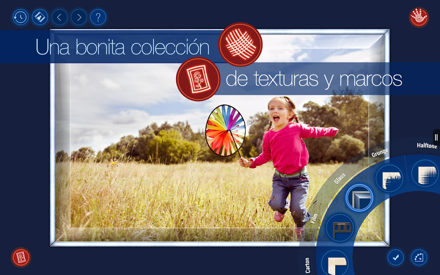 Aplica las texturas increíbles de Handy Photo a tus imágenes para darles la impresión realmente fantástica. Puedes eligir alguna de las siguientes categorías de texturas: Abstracto, Tela, Nublado, Escarcha e Hielo, Grunge, Papel, Agua y Madera. Es posible ajustar todas las texturas a gusto y aplicarlas a las fotos parcialmente.