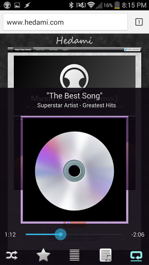 "Reproductor de música (Remix) pone otras aplicaciones de música a la vergüenza con una larga lista de características y un mini widget de golpe-up" - Policía Android