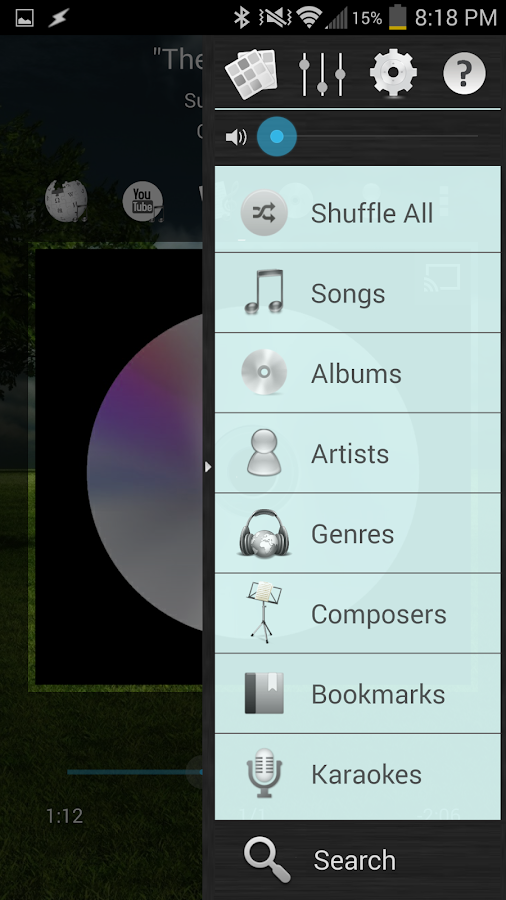 - Pase de derecha para su biblioteca de música, búsqueda, ayuda, preferencias, control de volumen, y la personalización estética.