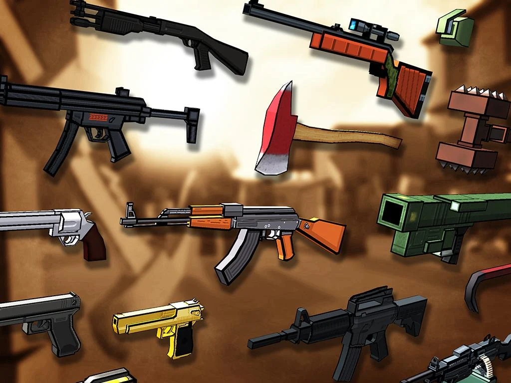 (Ametralladoras, Bazooka, pistolas, hachas y granadas, etc ..)