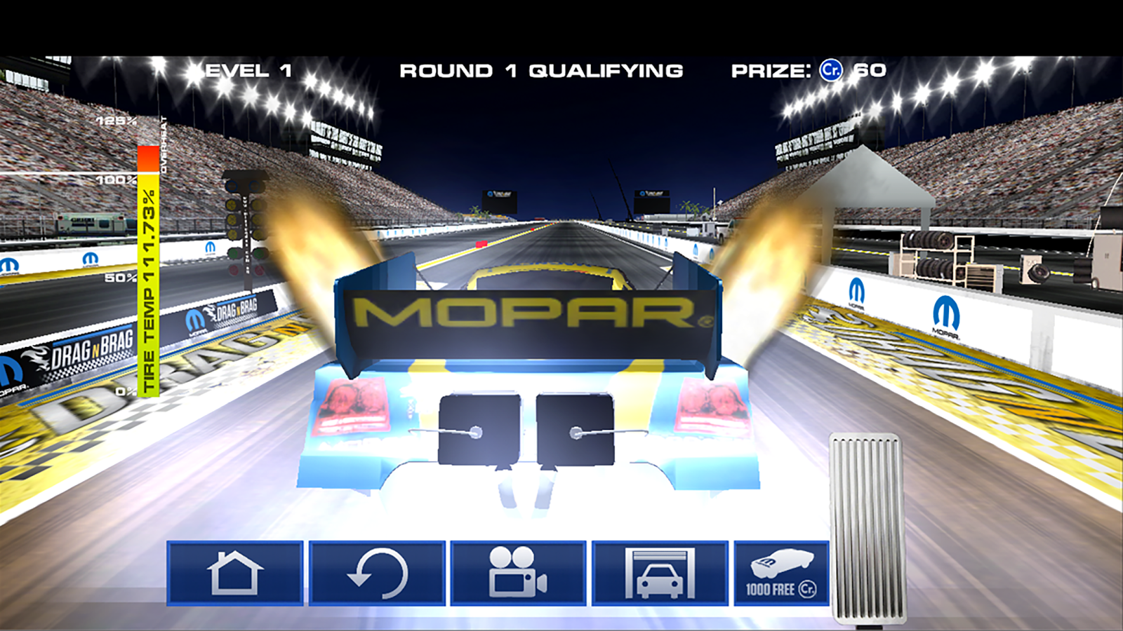 • QUEMADURAS etapa previa. Antes de cada paso de los conductores se les permite realizar una quema que limpia y calienta los neumáticos de su Mopar para mejorar la tracción. Observe la barra de temperatura de la izquierda, pero tenga cuidado, demasiada aceleración se sobrecaliente los neumáticos y reducir el agarre.