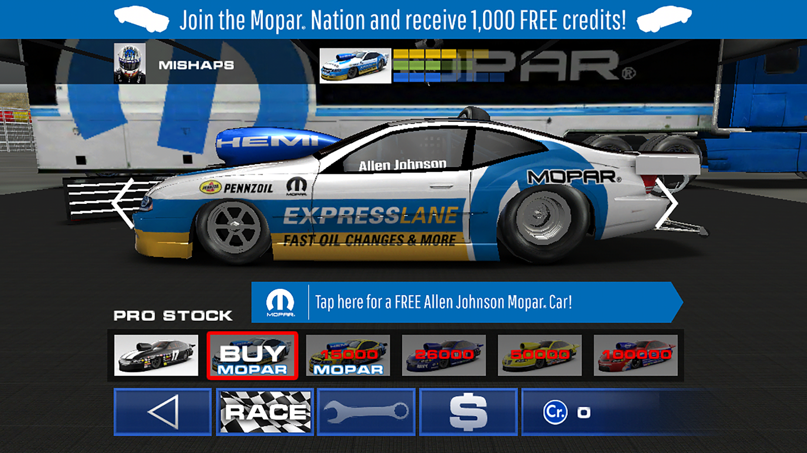 • MOPAR PODER! Ponte al volante de Allen Johnson o de Jeg Coughlin Jr. Pro Stock Mopar Dodge Avenger! Luego agarra el acelerador en Dodge Funny Car del cargador R de Matt Hagan / T!