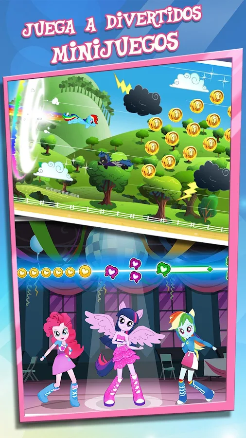 * Diviértete con los minijuegos de ponis: recoger manzanas, botar la pelota, alas mágicas, telescopio, mina de cristal y las chicas de Equestria.