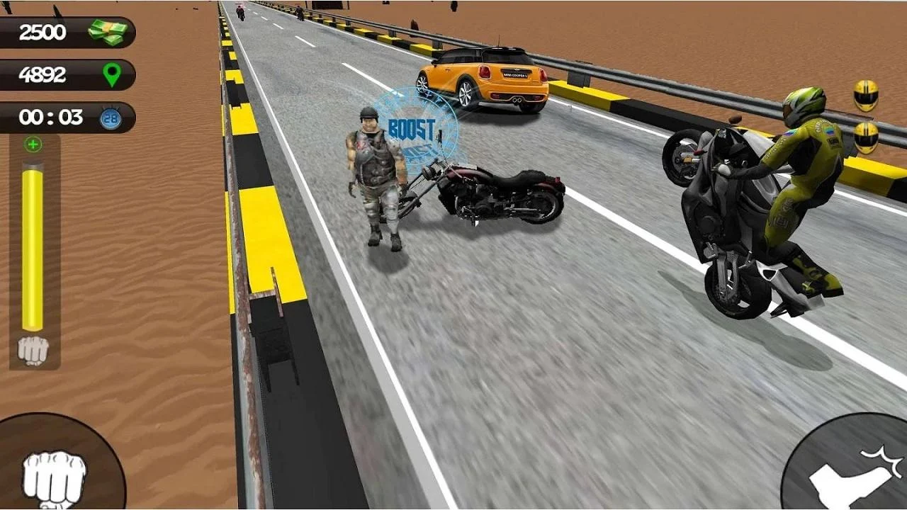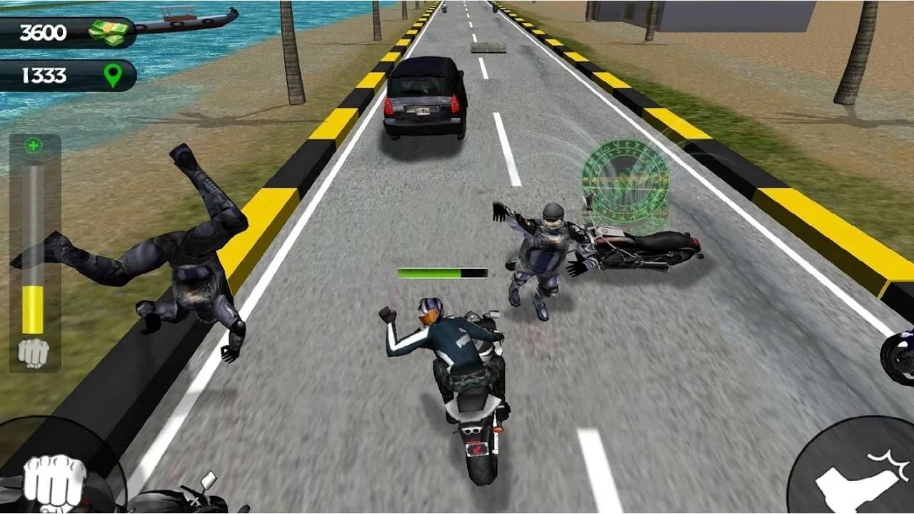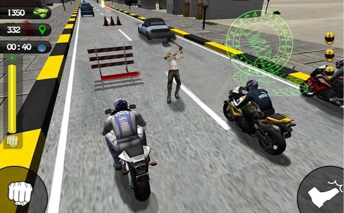 Tu misión es completar los niveles de carreras a través de los diferentes caminos. Puede golpear y patear a otras motos para limpiar su camino hacia la victoria. Usted puede desviar la atención de las bicicletas oponente por puñetazos y patadas. Utilice Nitro para aumentar la velocidad de tu moto. Gana la carrera y otra vez para ganar dinero en efectivo para que pueda comprar nueva moto del mercado.