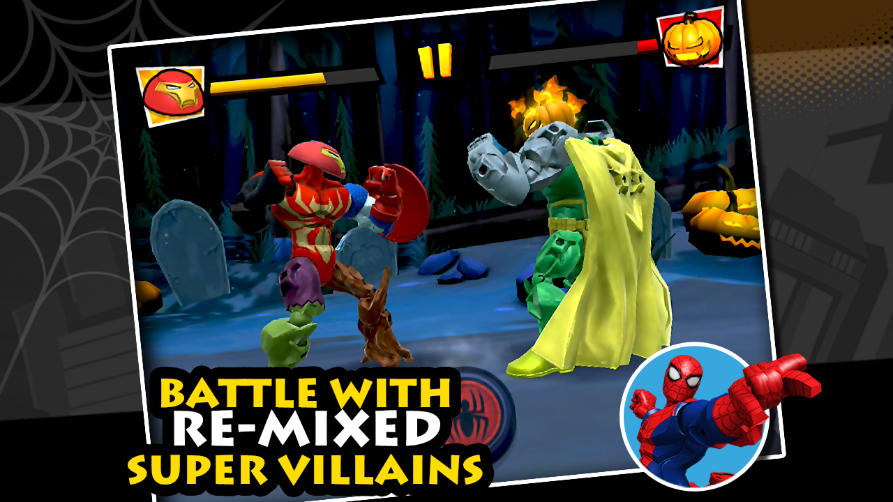 • Enfréntate a malvados robots y lucha contra supervillanos remezclados: ¡Duende Verde, Loki, Doctor Octopus y Ultrón!