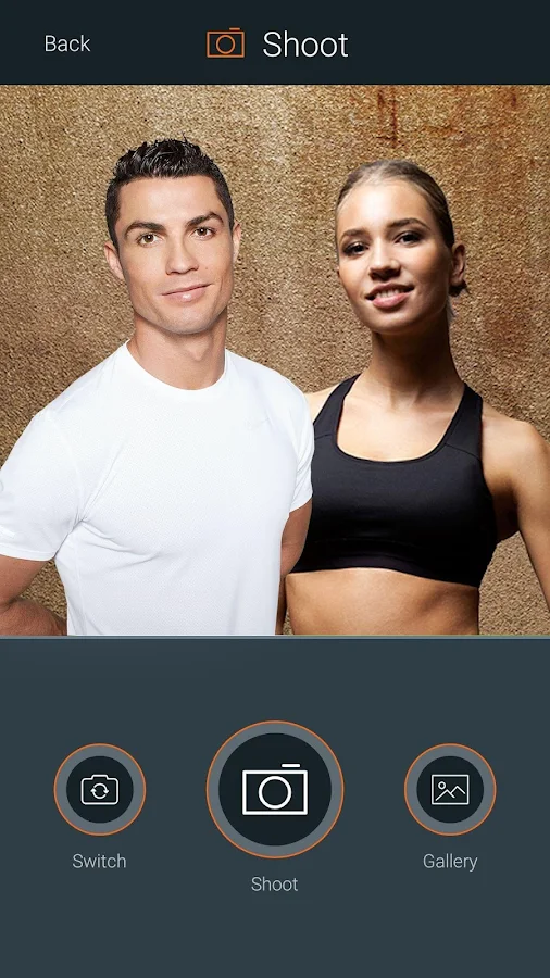 Elige uno de los 68 diferentes poses de Ronaldo, disparar una autofoto con él, ajustar la foto, se aplican los marcos,