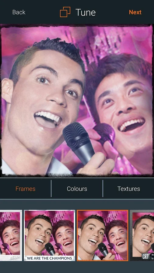Elige uno de los 68 diferentes poses de Ronaldo, disparar una autofoto con él, ajustar la foto, se aplican los marcos,