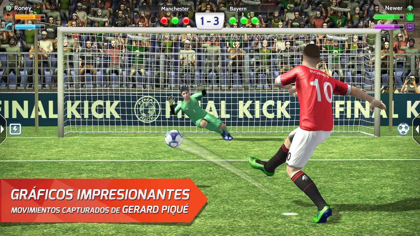 Disfruta de la tensión de los penales como si te jugaras la final de la Copa del Mundo de Fútbol compitiendo contra los mejores equipos, haciendo los goles y paradas más espectaculares acompañados de unos gráficos que te harán sentir primera fila de Maracaná. Perfecciona tus tiros especiales, tira con efecto, engaña a tu contrincante y ejecuta las paradas más impresionantes todo ello controlando el balón con un solo dedo para llegar a ser el Campeón del mundo.