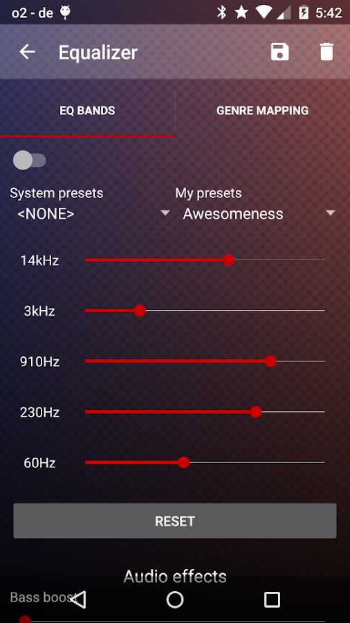 * Ecualizador con preajustes de usuario saveable que pueden estar vinculados a los géneros de música y desencadenaron-auto en tiempo de ejecución