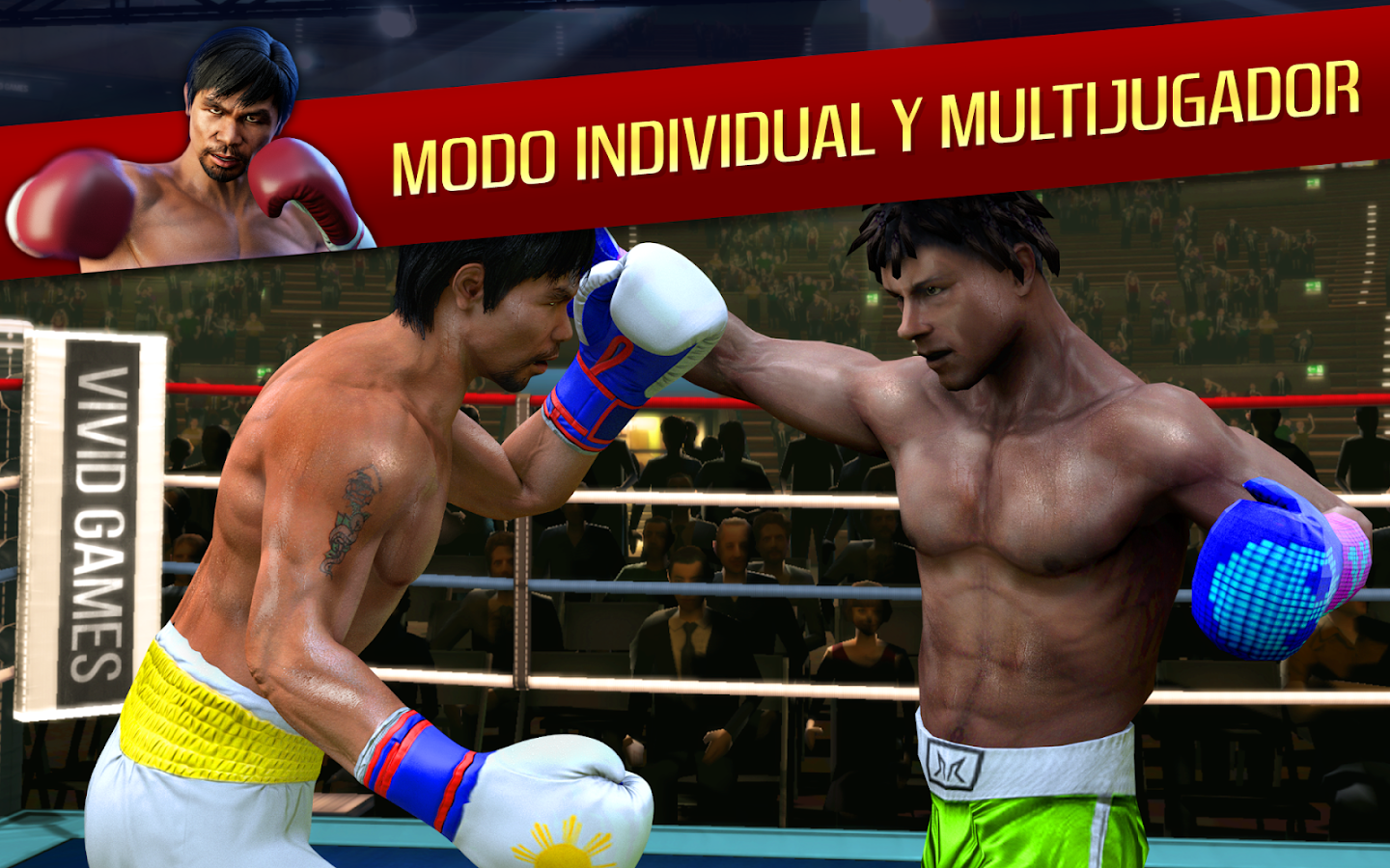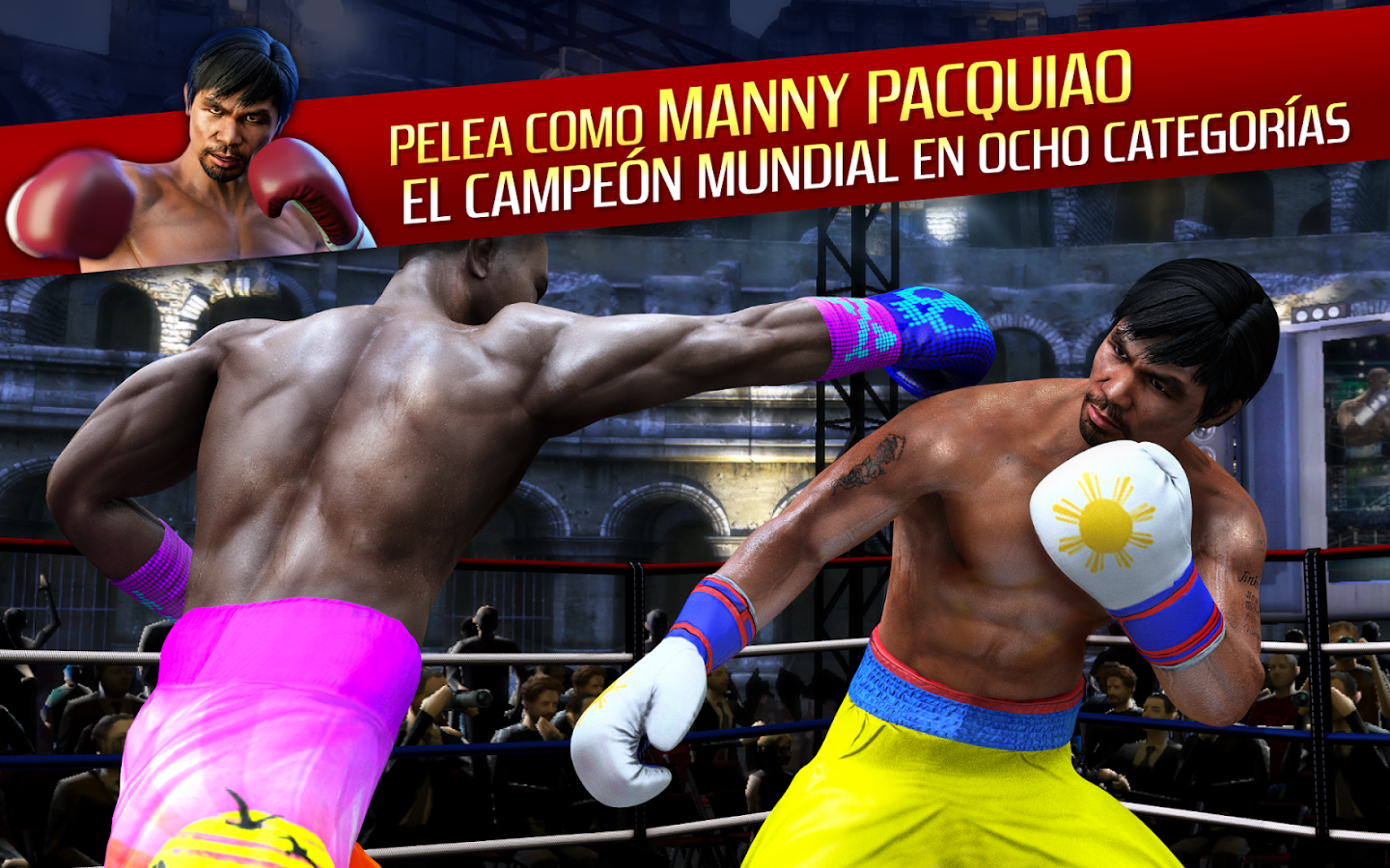 ¡Real Boxing®, el mejor juego móvil de box, tiene el orgullo de presentar al campeón mundial en ocho categorías distintas Manny Pacquiao!