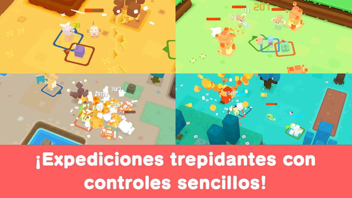 • ¡Toca la pantalla para combatir! Los sencillos controles te permiten disfrutar de combates trepidantes y divertidos. El peligro acecha, por lo que necesitarás la ayuda de tus aliados Pokémon en tus expediciones por la isla. Cuando aparezcan Pokémon salvajes, tus aliados se lanzarán al combate sin dudar y los derrotarán uno tras otro.
