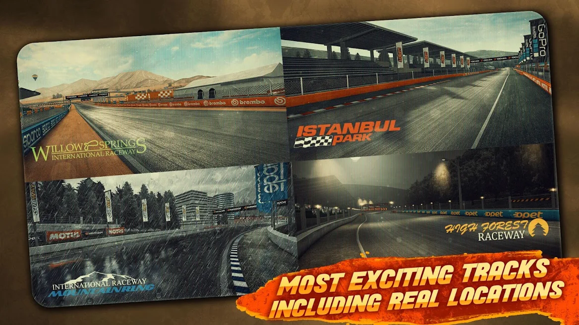 Pruebe sus habilidades de carrera en pistas de carreras creadas de manera realista, que incluyen lugares del mundo real como Willow Springs y Istanbul Park con condiciones climáticas de día / noche / lluvia.